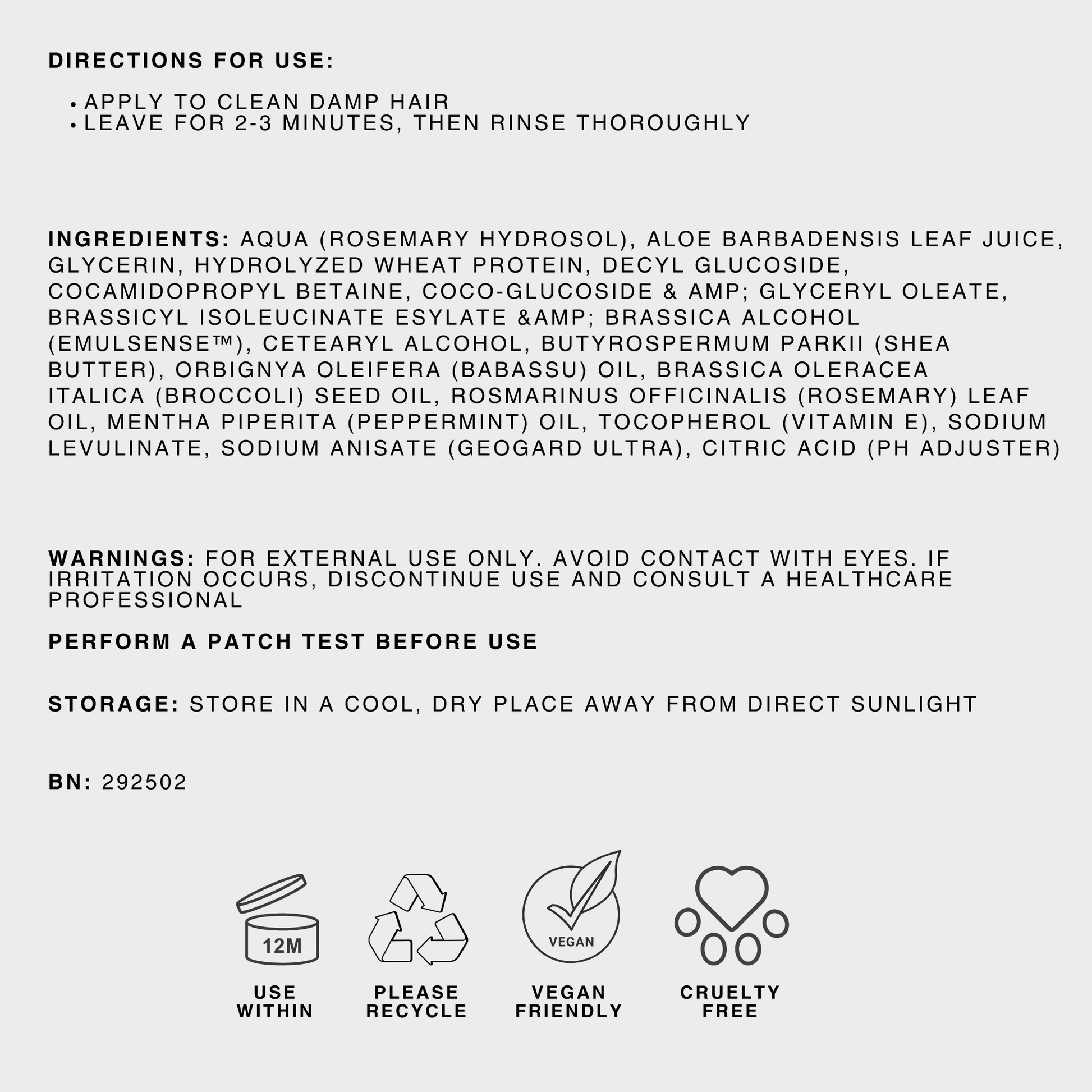 Aqua (Rosemary Hydrosol), Aloe Barbadensis Leaf Juice, Glycerin, Hydrolyzed Wheat Protein, Decyl Glucoside, Cocamidopropyl Betaine, Coco-Glucoside & Glyceryl Oleate, Brassicyl Isoleucinate Esylate & Brassica Alcohol (Emulsense™), Cetearyl Alcohol, Butyrospermum Parkii (Shea Butter), Orbignya Oleifera (Babassu) Oil, Brassica Oleracea Italica (Broccoli) Seed Oil, Rosmarinus Officinalis (Rosemary) Leaf Oil, Mentha Piperita (Peppermint) Oil, Tocopherol (Vitamin E), Sodium Levulinate, Sodium Anisate (Geogard Ultra), Citric Acid (pH Adjuster)